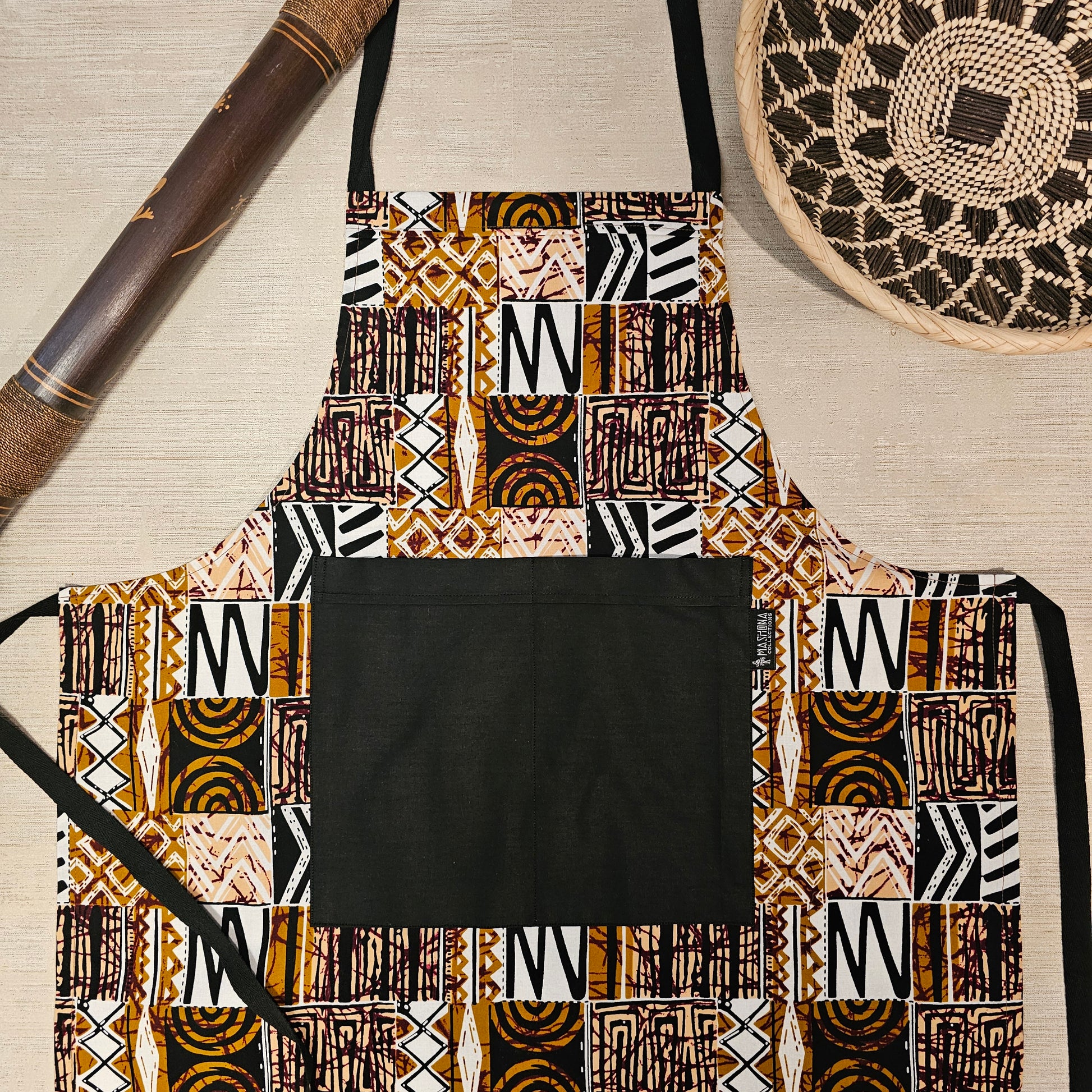 Designed to fit US sizes 6-12, this apron combines traditional African "Bogolan" prints with practical deep pockets. Measuring 65cm wide by 90cm long, it brings vibrant energy and joy to your cooking experience while offering lasting quality and comfort.